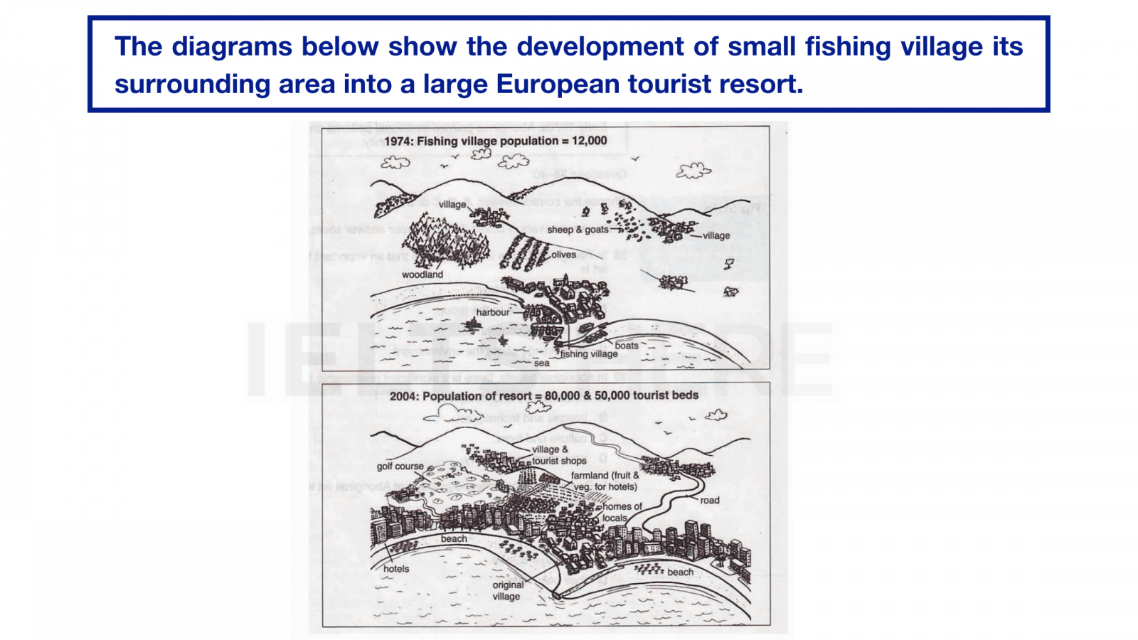 The diagrams below show the development of small fishing village its surrounding area into a large European tourist resort.